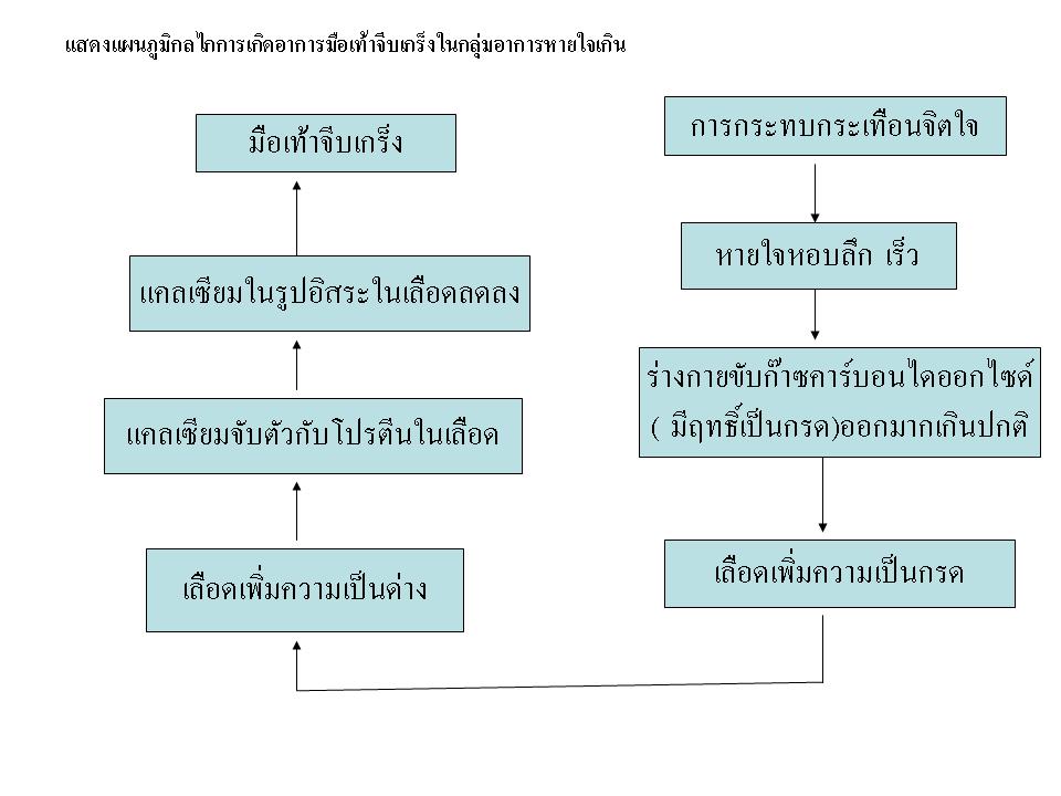 คำว่า “กลุ่มอาการ” (syndrome) นี้มีความหมายว่า จะมีอาการหลายอย่างปรากฏพร้อมกัน กล่าวคือเมื่อมีอาการหายใจหอบลึกและเร็วอยู่สักพักใหญ่ จะทำให้เกิดอาการมือและเท้าทั้ง 4 จีบเกร็งคล้ายเป็นตะคริวขึ้นพร้อมกัน ทั้งนี้เป็นไปตามปฏิกิริยาลูกโซ่(อิทัปปัจจยตา)ที่เกิดขึ้นภายในร่างกาย คือ เมื่อมีการหายใจมากเกิน(หอบลึก เร็ว)อยู่นานๆ จะทำให้ร่างกายขับก๊าซคาร์บอนไดออกไซด์ออกมากเกินปกติ เมื่อก๊าซนี้ซึ่งมีฤทธิ์เป็นกรดมีอยู่ในเลือดน้อยลง ก็ทำให้เลือดมีความเป็นด่างมากขึ้น เมื่อเลือดเป็นด่าง แคลเซียมในเลือดจะจับกับสารโปรตีน ทำให้มีแคลเซียมในรูปอิสระน้อยลง เกิดภาวะแคลเซียมในเลือดต่ำ ซึ่งทำให้กล้ามเนื้อเกิดการเกร็งตัว ในที่สุดจึงทำให้เกิดอาการมือเท้าจีบเกร็งร่วมด้วย (ดูตามแผนภูมิ)