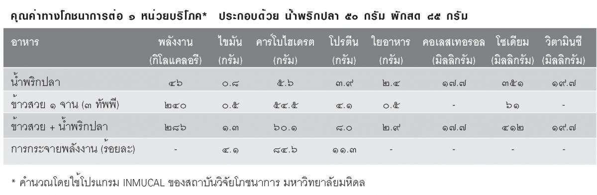 เมื่อดูที่ปริมาณใยอาหาร พบว่าน้ำพริกปลาพร้อม ข้าวสวยให้ใยอาหารคิดเป็นร้อยละ ๑๒ ของปริมาณที่ ควรกินใน ๑ วัน (แนะนำ ๒๕ กรัม) มีปริมาณคอเลส- เทอรอลและโซเดียมค่อนข้างน้อย เมื่อเปรียบเทียบกับปริมาณที่แนะนำว่าไม่ควรได้รับคอเลสเทอรอลเกิน ๓๐๐ มิลลิกรัม และโซเดียมไม่เกิน ๒,๔๐๐ มิลลิกรัมต่อวัน ส่วนปริมาณวิตามินซีที่มาจากผักสด ผักต้มและพืชผักใน น้ำพริกคิดเป็นร้อยละ ๓๓ ของปริมาณ ที่ร่างกายเราควรได้รับต่อวัน (แนะนำ ๖๐ มิลลิกรัม)