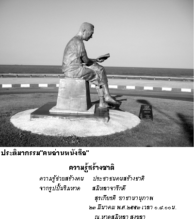 ที่น่าสนใจและรู้สึกให้ความหมายดี ก็คือรูปปั้น "คนอ่านหนังสือ" ที่หน้าโรงแรมที่พัก เมื่อได้อ่านคำอธิบายความหมายของประติมากรรมชิ้นนี้ที่ว่า "ความรู้สร้างคน คนสร้างชาติ" และได้ยินคำบอกเล่าจากชาวสงขลาว่า เคยมีการดำริของฝ่ายปกครองของเมืองนี้ "สงขลาเป็นเมืองแห่งการเรียนรู้" ผมเลยร้อยกรองอีกบทให้ชื่อว่า "ความรู้สร้างชาติ"