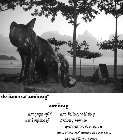 หลังจากได้เห็นรูปปั้นแมวตัวใหญ่ มีหนูตัวเล็กนั่งอยู่ที่หางแมว ตั้งตระหง่านอยู่ริมหาดสมิหลา ตรงกับแนวของเกาะหนู-เกาะแมว ก็นึกถึงคำของปราชญ์ทางพุทธศาสนา ที่เปรียบเทียบ "แมวคือสติ (ตัวรู้) หนูคืออารมณ์และความคิดปรุงแต่ง (ตัวคิด)" ก็เลยเรียงร้อยถ้อยคำออกมาเป็นกาพย์ดังกล่าว