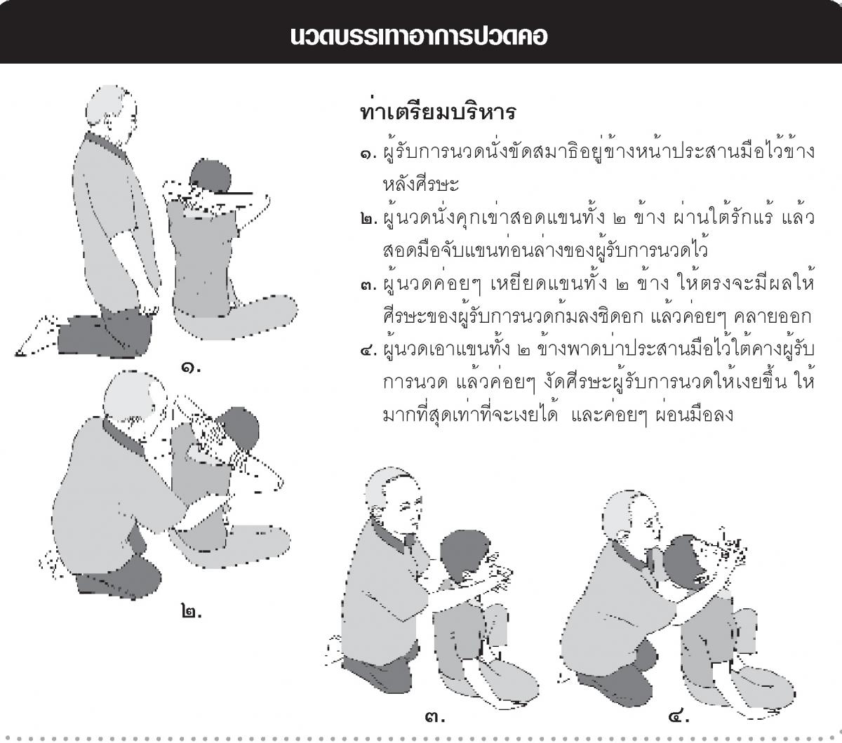 ๔. ผู้นวดเอาแขนทั้ง ๒ ข้างพาดบ่าประสานมือไว้ใต้คางผู้รับการนวด แล้วค่อยๆ งัดศีรษะผู้รับการนวดให้เงยขึ้น ให้มากที่สุดเท่าที่จะเงยได้ และค่อยๆ ผ่อนมือลง