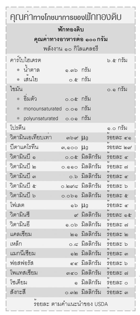 ฟักทองมีคุณค่าทางอาหารสูงแต่ให้พลังงานต่ำ จึงเหมาะแก่ผู้ที่ต้องควบคุมอาหารชื่อวิทยาศาสตร์ Cucurbita moschata Duchesne