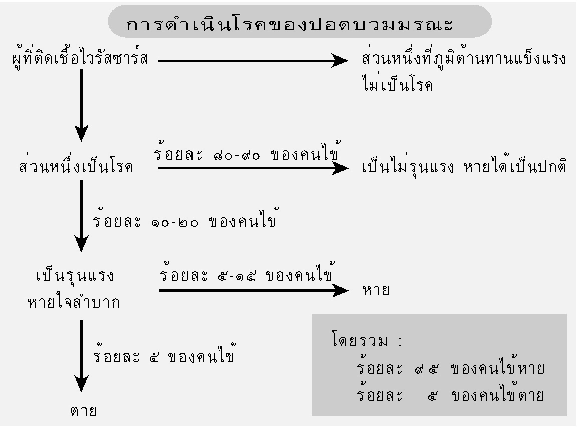 การดำเนินโรค ร้อยละ ๘๐-๙๐ ของผู้ที่เป็นโรคนี้มักจะมีอาการไม่รุนแรง ซึ่งจะหายได้เป็นปกติภายใน ๑ สัปดาห์ ประมาณร้อยละ ๑๐-๒๐ จะมีอาการหนัก คือหายใจลำบาก ซึ่งต้องใช้เครื่องช่วยหายใจ ประคับประคองให้พ้นขีดอันตราย กลุ่มนี้จะต้องพักรักษาตัวอยู่ในโรงพยาบาลนาน ๒-๓ สัปดาห์ ประมาณร้อยละ ๕ จะเสียชีวิต กลุ่มนี้มักมีอายุมากกว่า ๔๐ ปี หรือมีภูมิต้านทานร่างกายอ่อนแอ เช่น เป็นโรคเบาหวาน โรคไต หรือโรคประจำตัวอื่นๆ แต่อย่างไรก็ตาม คนอายุน้อยที่แข็งแรงถ้าเป็นโรคนี้ แล้วปล่อยจนอาการหนักค่อยรักษาก็อาจตายได้เช่นกัน