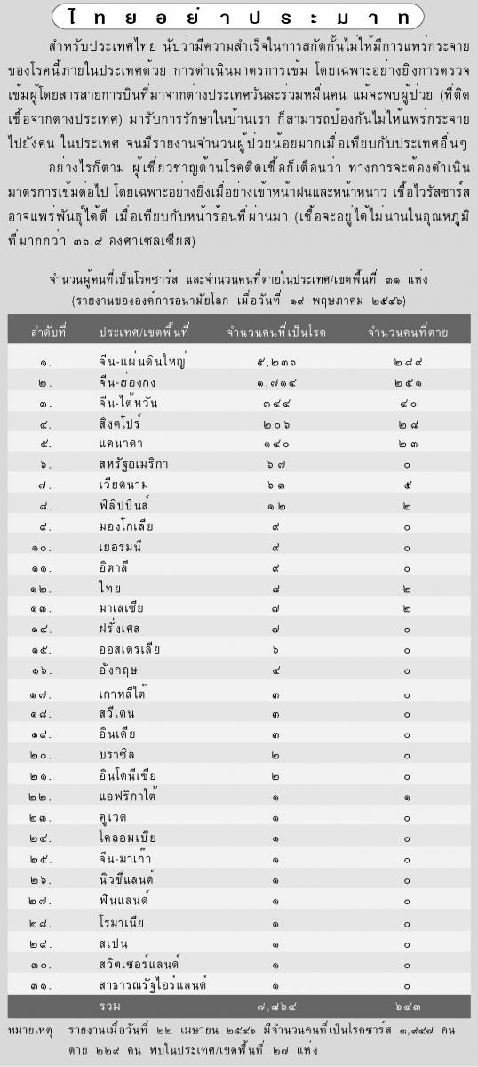 (รายละเอียดเกี่ยวกับโรคซาร์ส สามารถอ่านได้จากบทความเรื่อง "Sever acute respiratory syndrome (SARS)" ของ นฤมล จิรพนากร และ ยง ภู่วรวรรณ ในวารสารคลินิก ฉบับเดือนพฤษภาคม ๒๕๔๖)