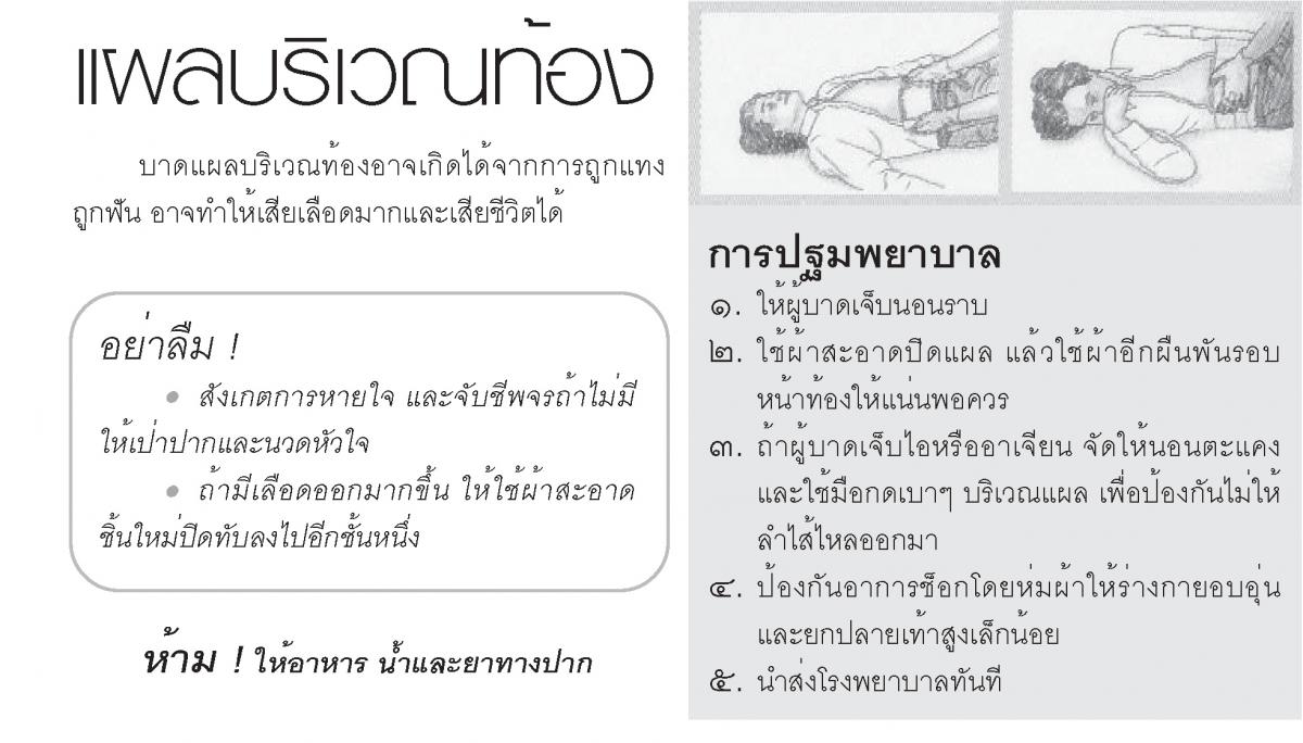 ๓. ถ้าผู้บาดเจ็บไอหรืออาเจียน จัดให้นอนตะแคง และใช้มือกดเบาๆ บริเวณแผล เพื่อป้องกันไม่ให้ลำไส้ไหลออกมา