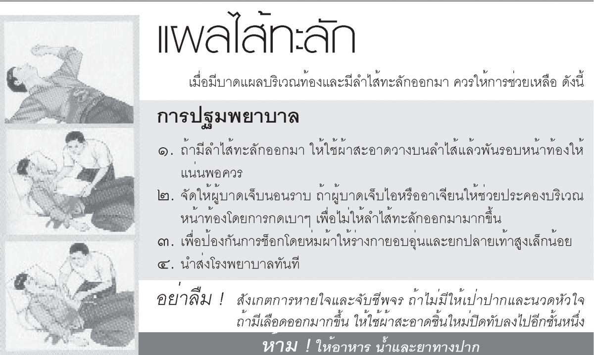 ๑. ถ้ามีลำไส้ทะลักออกมา ให้ใช้ผ้าสะอาดวางบนลำไส้แล้วพันรอบหน้าท้องให้แน่นพอควร
