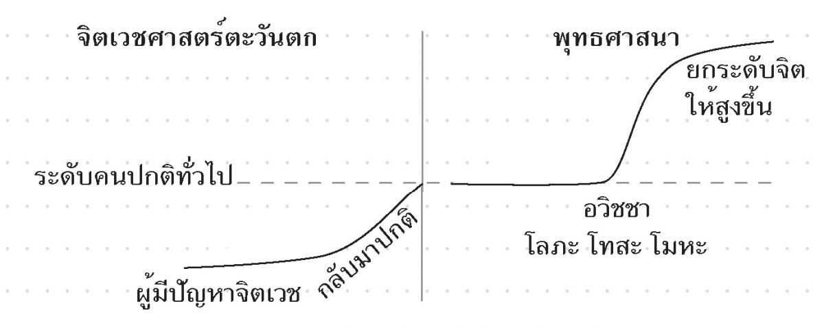 ตรงที่จิตแพทย์อเมริกันคัตเลอร์กับทะไล ลามะ คุยกันดังข้างต้นนั้น ควรจะเข้าใจความแตกต่างระหว่างจิตเวชศาสตร์ (Psychiatry) ตะวันตกกับพุทธศาสนา จิตเวชศาสตร์นั้นถือว่าคนที่มีปัญหาทางจิตเวชนั้น เช่น มีความทุกข์ ความบีบคั้น พฤติกรรมเบี่ยงเบนนั้น เป็นคนที่จิตตกต่ำไปจากคนปกติทั่วๆไป ต้องรักษาให้ "กลับมาปกติ" (ดูตามรูป)