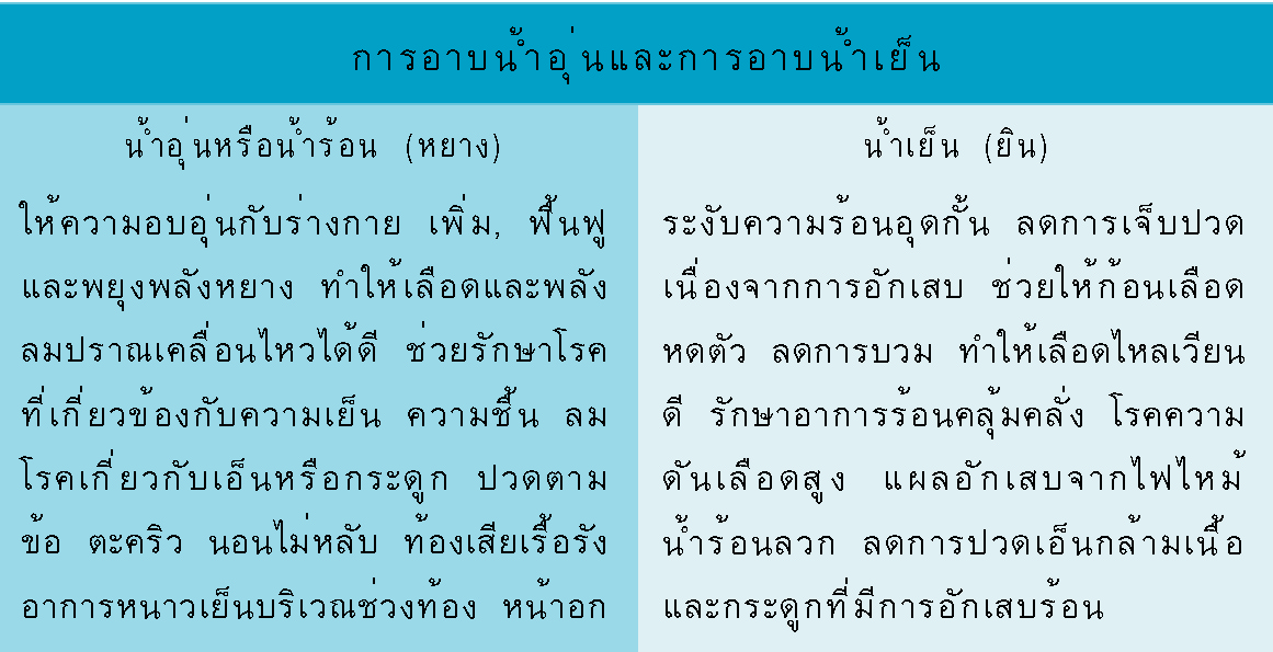 แพทย์แผนจีนได้กล่าวถึงศาสตร์ของการอาบน้ำอุ่นและอาบน้ำเย็นเพื่อสุขภาพไว้ ดังตาราง ข้างล่าง