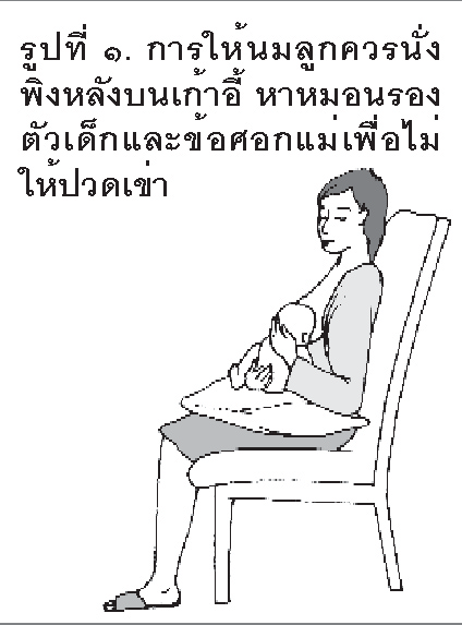 เก้าอี้ที่ดีสามารถนั่งพิงหลังได้สบาย ไม่ต้องมีที่เท้าแขน เพราะจะให้นมได้สะดวก และเก้าอี้ไม่ควรสูงจนเท้าไม่ถึงพื้น ถ้าจะให้ดียิ่งขึ้นพนักพิงควรมีความสูงระดับศีรษะเพื่อให้คุณแม่ได้พักกล้ามเนื้อคอ หาเบาะหรือหมอนมารองบริเวณข้อศอกเพื่อให้น้ำหนักของตัวเด็กและแขนแม่ตกลงไปที่หมอน (รูปที่ ๑) คุณแม่จะได้ไม่ต้องเกร็งกล้ามเนื้อบริเวณบ่า