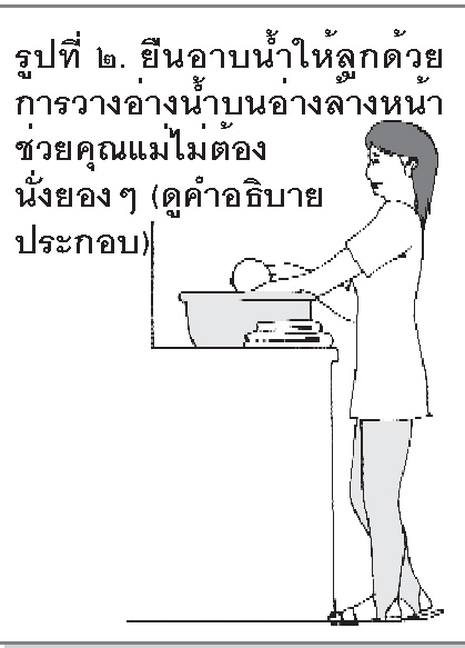 น้ำได้บนอ่างล้างหน้าเพื่อที่จะระบายน้ำออกทางอ่างล้างหน้า (รูปที่ ๒) เวลาเติมน้ำอาจใช้สายยางต่อน้ำจากก๊อกเตี้ย ไม่ต้องยกอ่างอาบน้ำพร้อมน้ำ เพราะจะหนักมาก (น้ำ ๑ ลิตรหนักประมาณ ๑ กิโลกรัม) เมื่อวางอ่างแล้วคุณพ่อควรทดสอบความปลอดภัยและความมั่นคง ไม่ให้อ่างตกลงพื้น ลูกจะเป็นอันตรายได้