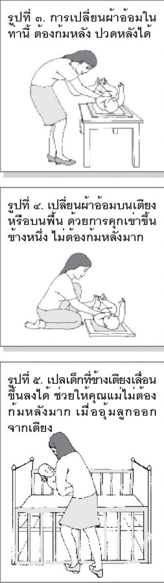 การเปลี่ยนผ้าอ้อมเป็นงานที่ต้องทำบ่อยครั้ง ควรเปลี่ยนผ้าอ้อมบนเตียง หรือพื้นโดยการคุกเข่าข้าง หนึ่งข้างลำตัวเด็ก ไม่ควรวางเด็กบนโต๊ะเตี้ยหรือโซฟาแล้วก้มตัวไปเปลี่ยนผ้าอ้อมจะเป็นการใช้กล้ามเนื้อหลังมากเกินไป (รูปที่ ๓ และ ๔)