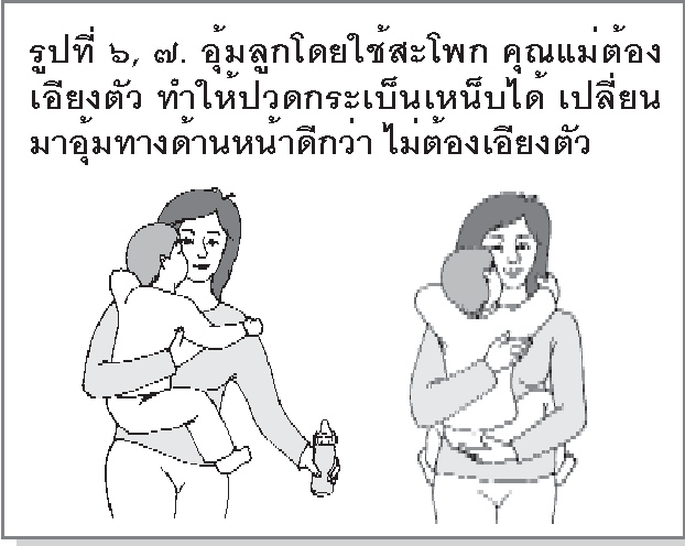 เนื่องจากคุณแม่มักจะมีอาการปวดบริเวณกระเบนเหน็บจากการที่ข้อหลวมดังที่ได้กล่าวมาแล้ว การ อุ้มเด็กด้วยสะโพกจะทำให้คุณแม่ต้องเอียงตัวไปด้านตรงข้าม เกิดแรงกดที่ข้อบริเวณกระ-เบนเหน็บเกิดอาการปวดและอักเสบของข้อได้ การอุ้มเด็กควรอุ้ม ทางด้านหน้าใช้มือข้างที่ถนัดช้อนก้นเด็กไว้ ขณะที่อีกมือใช้ประคองศีรษะหรือหลังเด็กไว้ (รูปที่ ๖ และ ๗)