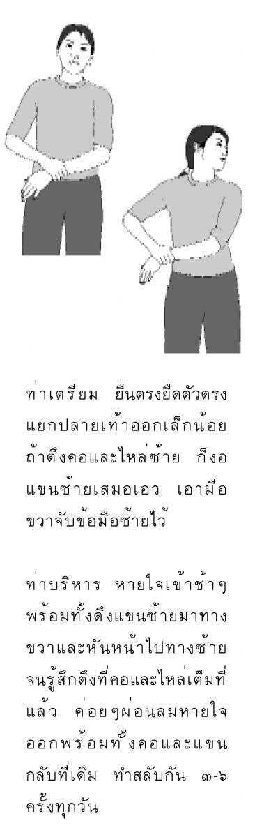 มีสุภาพสตรีรายหนึ่งอายุ ๗๐ ปีแล้ว เป็นโรคนี้ประจำ ต้องมานวดกับผมทุกสัปดาห์ เธอบอกผมว่าเป็นทุกข์มาก เพราะมีลูกสาวอยู่คนหนึ่ง ก็ต้องผ่าตัดเอามดลูกออก ทำให้ไม่สามารถมีทายาทไว้รับมรดก เพราะครอบครัวมีฐานะรวยมาก นี่ก็เป็นสาเหตุหนึ่งของคนรวยที่มีทุกข์ และยังมีอีกหลายสาเหตุ ที่ทำให้ตึงคอและไหล่ เดี๋ยวนี้ผมสังเกตว่ามีคนเป็นโรคนี้เข้ามานวดกันเยอะมากเป็นอันดับหนึ่ง แต่ละรายพอนวดเสร็จแล้วผมก็แนะนำให้บริหารท่าฤาษีดัดตนที่ผมนำมาเขียนนี้ ทุกรายส่วนมากบอกว่าทำง่ายดี และช่วยให้หายตึงคอไหล่ได้ดีด้วย