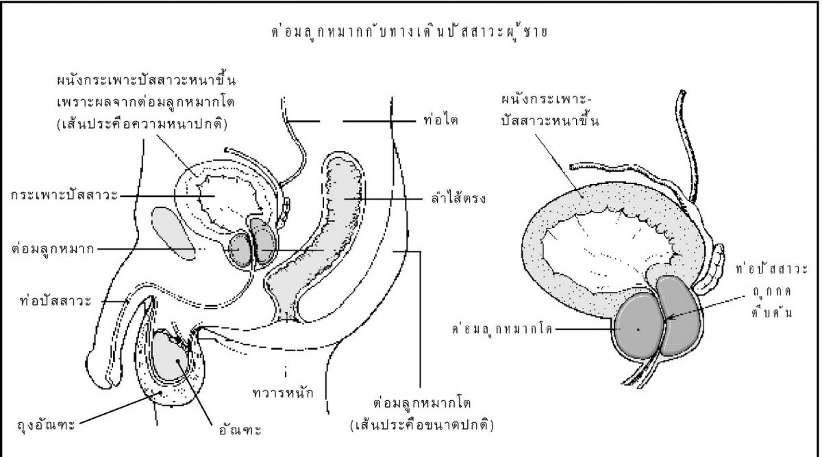 ๓. โรคต่อมลูกหมากโตมีอาการอย่างไร โรคต่อมลูกหมากโตเป็นโรคเกี่ยวกับทางเดินปัสสาวะ ซึ่งมี ๒ ระยะ คือ ระยะแรก จะมีอาการปัสสาวะบ่อย จากที่เคยลุกขึ้นปัสสาวะในตอนกลางคืน ๑-๒ ครั้ง หรือไม่ลุกเลย จะลุกขึ้นบ่อย ๓-๔ ครั้งขึ้นไป จนรบกวนการนอนหลับ ในเวลากลางวันก็มีอาการปัสสาวะบ่อยแต่คนไข้จะปรับตัวได้จนไม่รู้สึก ระยะที่สอง ต่อมาจะรู้สึกว่า ปัสสาวะนานกว่าจะออก ต้องเบ่ง บางครั้งต้องรอ ๑-๒ นาทีจึงจะออก และจะเป็นมากขึ้นเรื่อยๆ ปัสสาวะไม่พุ่ง แทนที่จะพุ่งไปข้างหน้าก็พุ่งน้อยลง พอปัสสาวะเสร็จยังมีหยดออกมาอีก ในที่สุดจะปัสสาวะไม่ออกเลย คนไข้มักจะมาหาหมอด้วยอาการปัสสาวะไม่ออกเลย ปัสสาวะแน่นท้อง ต้องใช้วิธีสวนออกให้ และให้การรักษาต่อไป