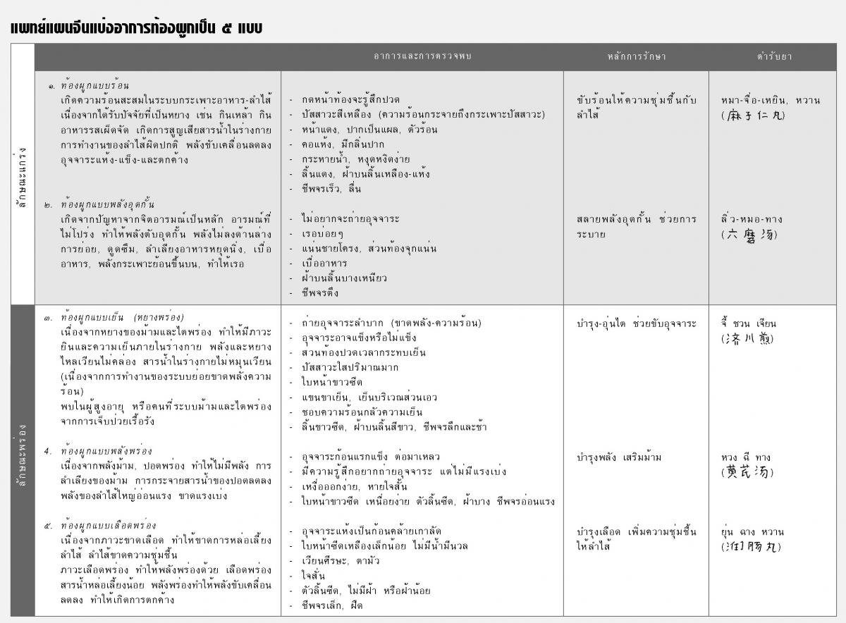 สรุป : ภาวะท้องผูกต้องพิจารณาสาเหตุที่เป็นต้นเหตุ ไม่ว่าในแผนปัจจุบันหรือแผนจีนก็ตาม ในรายที่เป็นเรื้อรังไม่ควรใช้ยาถ่ายหรือยาระบายอย่างพร่ำเพรื่อ ในทางแพทย์จีนถือว่าจะทำให้เสียน้ำ เสียพลังมากขึ้น ทำให้พื้นฐานของการเสียสมดุลมากขึ้นอีก การรักษาจึงต้องรักษาองค์รวมของร่างกายเป็นหลัก ร่วมกับใช้ยาระบายเป็นตัวเสริม เมื่อร่างกายองค์รวมดีแล้วเท่านั้น อาการท้องผูกจึงจะหายได้ โดยร่างกายไม่เสียหายมากขึ้น จึงจะเป็นการรักษาภาวะสมดุลที่แท้จริง