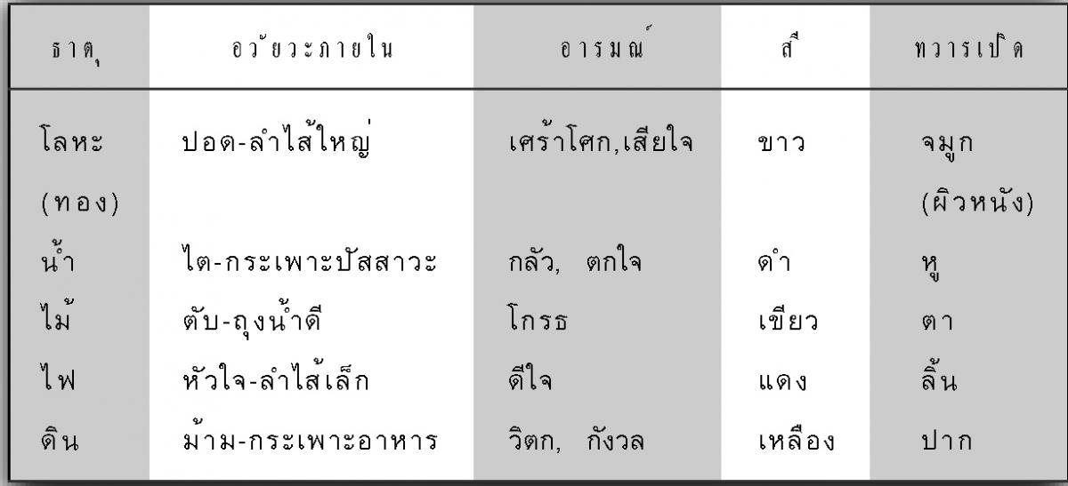 แพทย์แผนจีนได้จำแนก สรรพสิ่งในธรรมชาติ รวมทั้งร่างกายของคนเราเป็น ๕ ธาตุ (ปัญจธาตุ) ตัวอย่างเช่น