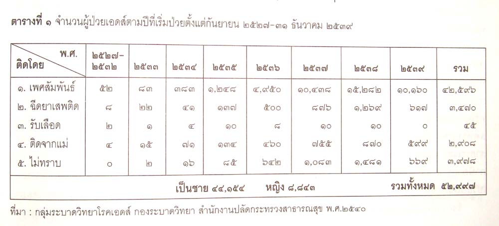โรคเอดส์จากประเทศสหรัฐอเมริกามาป่วยและตายในประเทศไทยตั้งแต่นั้นมา โรคเอดส์ก็ได้แพร่ระบาดไปทั่วประเทศไทยอย่างรวดเร็ว จากการส่งเสริมการท่องเที่ยว และ “เซ็กซ์ทัวร์” ที่ระบาดในช่วงนั้น ในปัจจุบัน มีคนไทยติดเชื้อโรคนี้กว่าแปดแสนคนเพราะมีผู้ที่ป่วยเป็นโรคเอดส์แล้วกว่า๕๐,๐๐๐ คน (ดูตารางที่ ๑) แม้แต่ในป่าเขาลำเนาไพร ชาวบ้านผู้ยากไร้ก็ยังได้รับเชื้อนี้จาก “ทัวร์ป่า” ต่างๆ รวมทั้งผู้ต้องขังในเรือนจำก็ยังได้รับเชื้อนี้ ดังตัวอย่างที่ไม่กี่เดือนก่อน ผู้ต้องหาปล้นธนาคารรายหนึ่งรับสารภาพว่า ตนได้รับเชื้อในเรือนจำ และอีกไม่นานตนจะต้องตาย จึงปล้นเอาเงินไปใช้หาความสุข(พร้อมกับแพร่เชื้อให้แก่ผู้อื่น?) เสียก่อนตาย (แล้วก็เลยผูกคอตายในห้องขังหนีหนี้กรรมไปก่อน) ผู้ติดเชื้อกว่าแปดแสนคนนี้ จึงเป็นภาระต่อรัฐและต่อสังคมอย่างมหาศาล รัฐสามารถให้ยาเพื่อหยุดยั้งการเสื่อมโทรมของสุขภาพและเพื่อลดการเป็นพาหะแพร่เชื้อได้ไม่กี่ร้อยคน ที่เหลืออีกกว่าแปดแสนคนจึงสามารถแพร่เชื้อต่อไป ในยุคโลกาภิวัตน์ที่ข้อมูลข่าวสารประเภทปลุกเร้ากามารมณ์และกิจกรรมทางเพศได้แพร่ระบาดอย่างรุนแรงและต่อเนื่องมาตลอด