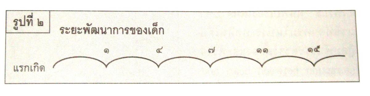 พัฒนาการของเด็กแต่ละช่วงมีความสำคัญมาก เพราะเป็นพื้นฐานของพัฒนาการในช่วงถัดไปตามลำดับ โดยแบ่งระยะพัฒนาการของเด็กได้ดังนี้ คือ แรกเกิด หนึ่งขวบ สี่ขวบ เจ็ดขวบ สิบเอ็ดขวบ และสิบห้าขวบ (ดูรูปที่ ๒)