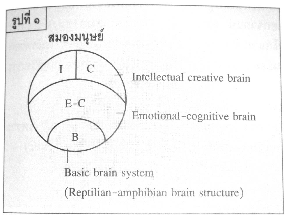 ๑. ส่วนที่เป็นสมองพื้นฐาน (Basic brain system) ซึ่งเหมือนกับสมองของสัตว์เลื้อยคลานทั้งหลายที่พัฒนามาร้อยล้านปีแล้ว เป็นสมองส่วนที่ควบคุมการเคลื่อนไหวทางกายภาพ มีชื่อเรียกเป็นภาษาอังกฤษว่า Rertilian-amphibian brain structure อาจารย์หมอประเวศ วะสี ตั้งชื่อภาษาไทยให้ว่า สมองตะกวด