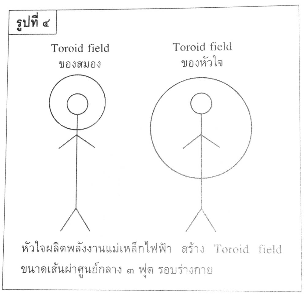 กล่าวคือ สัญญาณจากหัวใจมีผลต่อสมองส่วน E-C(Emotional coguitive brain System) ซึ่งควบคุมฮอร์โมนของร่างกายทั้งหมด นอกจากนั้น หัวใจยังก่อให้เกิดพลังงานแม่เหลกไฟฟ้า ซึ่งมีพลังสูงกว่าสมองถึง ๔๐-๖๐ เท่า (๒ วัตต์) (ดูรูปที่ ๔)