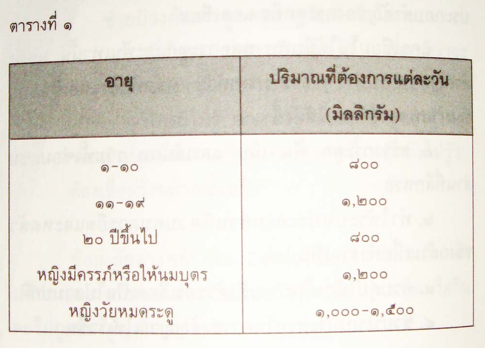 คำถามที่หลายคนคงจะสงสัย คือ แล้วเราจะรู้ได้อย่างไรว่าเราได้รับแคลเซียมเพียงพอในแต่ละวัน ปริมาณแคลเซียมให้อาหารที่จะได้รับ หากเทียบกับนมโดยที่เราต้องการแคลเซียมวันละ ๘๐๐- ๑, ๒๐๐ มิลลิกรัม ก็ควรดื่มนมสด (รสจืด) ประมาณ ๗๐๐-๑,๐๐๐ มิลลิลิตร หรือ ๓-๔ แก้ว (ขนาดปกติ) โดยต้องคิดว่าไมได้รับแคลเซียมจากอาหารชนิดอื่นเลย แต่ถ้าได้รับจากอาหารอื่นด้วยก็ลงปริมาณนมลงได้ตามสัดส่วน