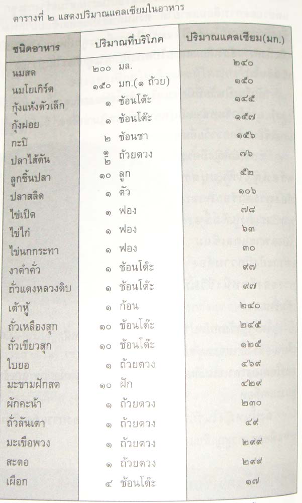 การที่เราจะไปให้คนทุกคนดื่มนมก็คงทำได้ยาก บางโอกาสฐานะไม่ให้ ไม่สามารถซื้อนมกินได้ ก็ต้องกินปลาทดแทน แม้แต่ปลาร้าก็หมักทั้งตัวแล้วเรากินได้ทั้งกระดูกก็ให้แคลเซียมได้ไม่น้อย อาหารทะเลบางชนิด เช่น หอยแครง หอยลาย โดยเฉพาะส่วนที่เป็นเอ็นหรือกระดูกอ่อน ซึ่งตรงนั้นเป็นแหล่งแคลเซียมที่ค่อนข้างดี ส่วนเต้าหู้แข็งที่ขายเป็นก้อน จะมีแคลเซียมที่เติมลงไปใกล้เคียงกับนมมากทีเดียว เต้าหู้ขาวอ่อน (ไม่ใช่เต้าหู้ไข่) จะมีน้อยกว่าเต้าหู้แข็ง แต่ถ้าเป็นน้ำเต้าหู้จะน้อยมาก เพราะเจือจาง โดยปกติถั่วเหลืองมีแคลเซียมปริมาณพอสมควร แต่ถ้าไปทำเป็นน้ำถั่วเหลืองแล้วจะได้แคลเซียมที่ละลายออกมาน้อยมากเพราะแคลเซียมไปอยู่ในส่วนที่เป็นกากที่เราไม่ใช้ แต่ถ้าเราเอากากถั่วเหลืองไปทำเป็นอะไรกินได้ เราก็จะได้แคลเซียมจากตรงนั้น
