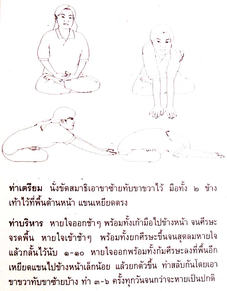 ท่าบริหาร หายใจออกช้าๆ พร้อมทั้งเก้ามือไปข้างหน้า จนศีรษะจรดพื้น หายใจเข้าช้าๆ พร้อมทั้งยกศีรษะขึ้นจนสุดสมหายใจ แล้วกลั้นไว้นับ ๑-๑๐ หายใจออกพร้อมทั้งก้มศีรษะลงที่พื้นอีก เหยียดแขนไปข้างหน้าเล็กน้อย แล้วยกตัวขึ้น ทำสลับกันโดยเอาขาขวาทับขาซ้ายบ้าง ทำ ๓-๖ ครั้งทุกวันจนกว่าจะหายเป็นปกติ