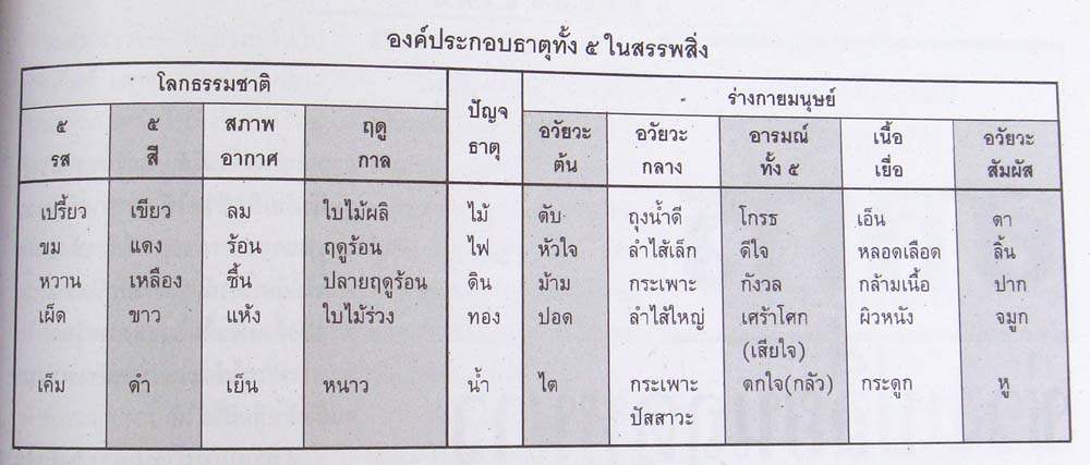 อวัยวะภายในทั้ง ๕ ได้แก่ หัวใจ ตับ ม้าม ปอด ไต มีความสัมพันธ์กับสีทั้ง ๕ คือ แดง เขียว เหลือง ขาว ดำ