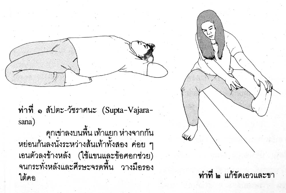 ที่ศูนย์พัฒนาอาชีพคนตาบอดปากเกร็ด มีหมอนวดผู้ชายตาบอดคนหนึ่ง เป็นคนที่ขาไม่ค่อยจะแข็งแรง เขาเข้าไปหาผมขณะที่ผมสอนนวดอยู่ที่นั่น เขาบอกผมว่าปวดเข่ามาก ผมก็บอกให้เขานั่งคุกเข่าลงบนเตียงนวด เท้าแยกห่างจากกัน หย่อนก้นนั่งระหว่างส้นเท้าทั้งสอง ค่อยๆ เอนตัวลงข้างหลัง ใช้แขนและศอกช่วย นอนลงไปช้าๆ จนกระทั่งหลังและศีรษะจรดพื้น วางมือรองใต้คอ หายใจเข้าออกตามธรรมดาโดยไม่ต้องออกแรง และอยู่ในท่านี้นานเท่าที่จะทนได้ คนที่ไม่เคยทำไม่ควรหักโหม ควรค่อยๆ ทำเท่าที่จะทำได้ไปก่อน