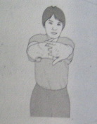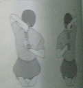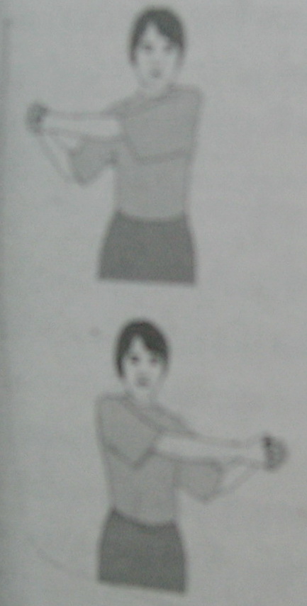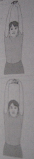 ไขว้มือข้างหนึ่งไปด้านหลัง งอข้อศอกขึ้น เหยียดมืออีกข้างขึ้นเหนือศีรษะ งอศอกลงเกี่ยวนิ้วมือทั้ง 2 ไว้ด้วยกัน