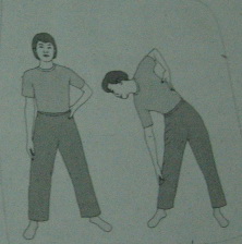 วิธีทำ : ยืนตรงเท้าทั้งสองห่างจากกัน 2 ฟุต มือซ้ายเท้าเอว เอียงตัวและศีรษะไปด้านขวา ขณะเอียงลงควรให้แผ่นหลังตรง และค่อย ๆ เลื่อนแขนขวาลงไปที่เข่า แขนซ้ายค่อย ๆ เลื่อนขึ้นมาที่รักแร้ จากนั้นทำสลับข้าง