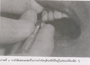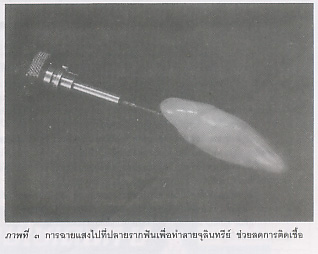 นอกจากนี้ประโยชน์ของแสงเลเซอร์ในการทำลายเชื้อจุลินทรีย์ยังถูกนำมาใช้ประกอบการรักษาคลองรากฟัน โดยการฉายแสงไปที่บริเวณปลายรากฟันเพื่อทำลายจุลินทรีย์ ช่วยลดการติดเชื้อได้(ดังภาพที่ 3)
