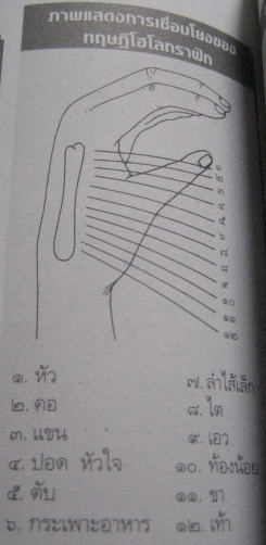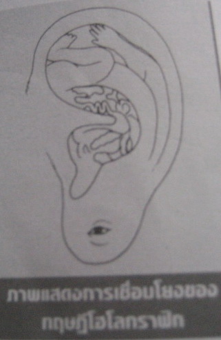 3. ทฤษฎีโฮโลกราฟิก ทฤษฎีนี้ได้เสนอโดยนักวิทยาศาสตร์จีน ชื่อ จางอิ่งชิง (ปี พ.ศ. 2529) ภายหลังที่เขาได้ศึกษา (ตั้งแต่ พ.ศ. 2515) พบว่ากระดูกฝ่ามือท่อนที่ 2 ของนิ้วชี้ เป็นหน่วยไฮโลกราฟิกเล็ก ๆ ที่สามารถสะท้อนรหัสชีวภาพของร่างกายทั้งร่างกายได้ เช่น ปวดศีรษะจะตรวจพบความผิดปกติบริเวณหมายเลข 1 หรือทำนองเดียวกันจะตรวจพบความผิดปกติบริเวณศีรษะของใบหู (ดูรูปหู)