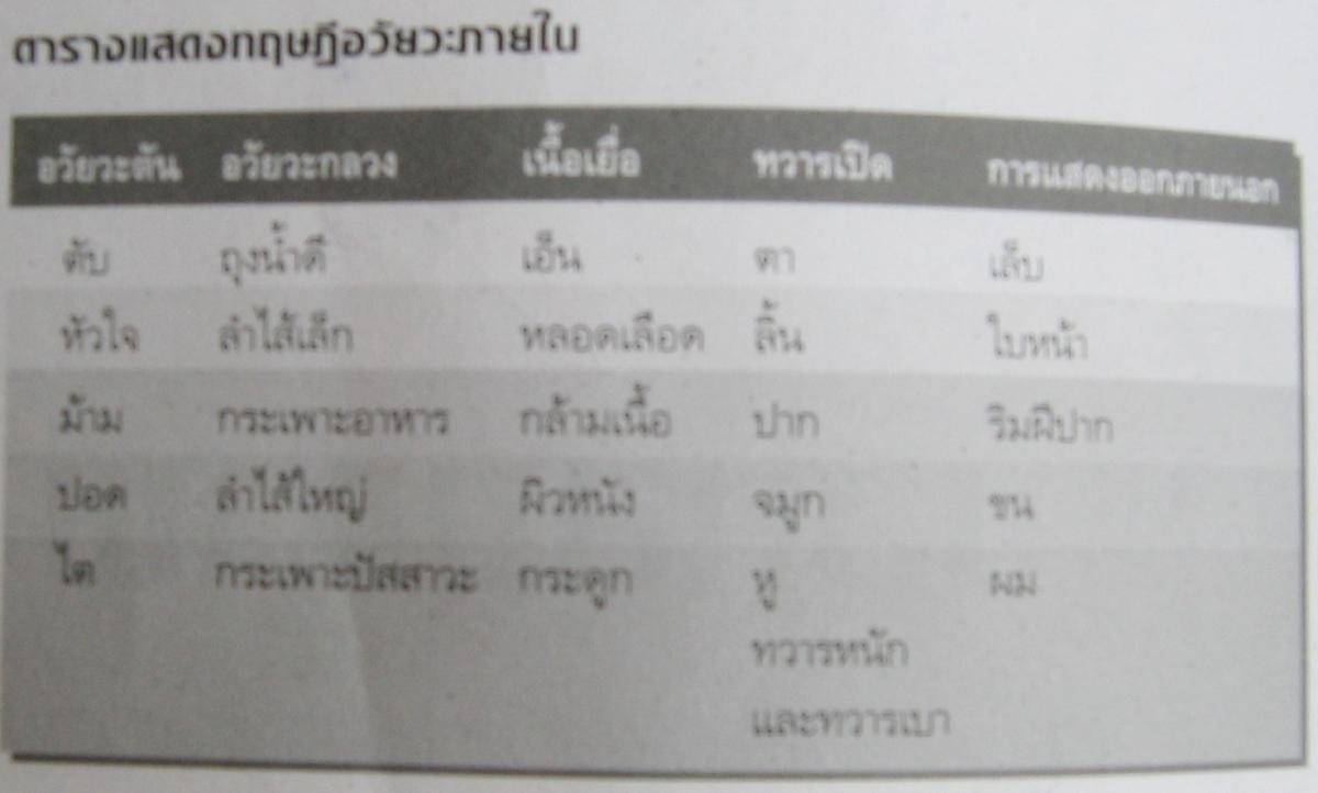 2. ทฤษฎีอวัยวะภายใน (จั้งฝู่) นอกจากอวัยวะภายในเชื่อมต่อกับส่วนภายนอกของร่างกายด้วยเส้นลมปราณแล้ว ยังมีความสัมพันธ์กับอวัยวะภายใน เนื้อเยื่อ อวัยวะสัมผัส (ทวาร) ต่าง ๆ