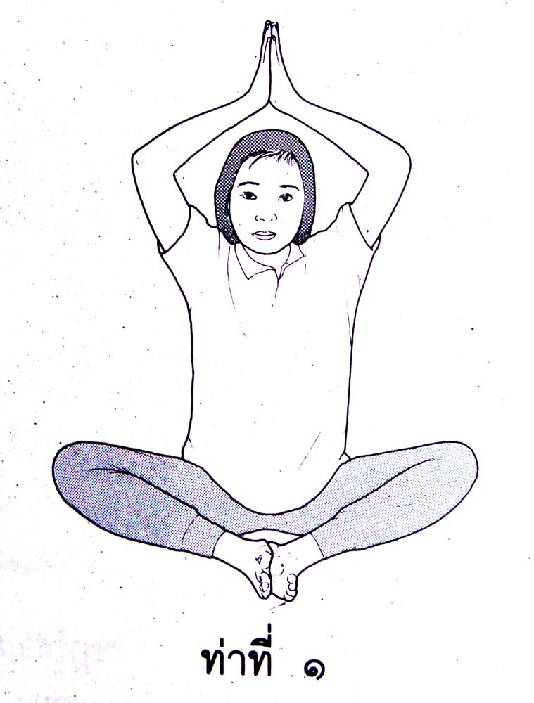 ท่าที่ 2 นั่งท่าเอาฝ่าเท้าชนกัน แยกเข่า ตั้งตัวให้ตรง พนมมือไว้บนศีรษะดันฝ่ามือเข้าหากัน หายใจเข้าช้าๆ พร้อมทั้งเหยียดแขนทั้งสองข้างให้ตึงในท่าพนมมืออยู่ ท่านี้พอเหยียดเต็มที่แล้วจะมีความรู้สึกตื้อไปทั้งศีรษะและคอ พอหายใจออกแล้ว ก็ผ่อนมือกลับมาที่ศีรษะในท่าเดิม