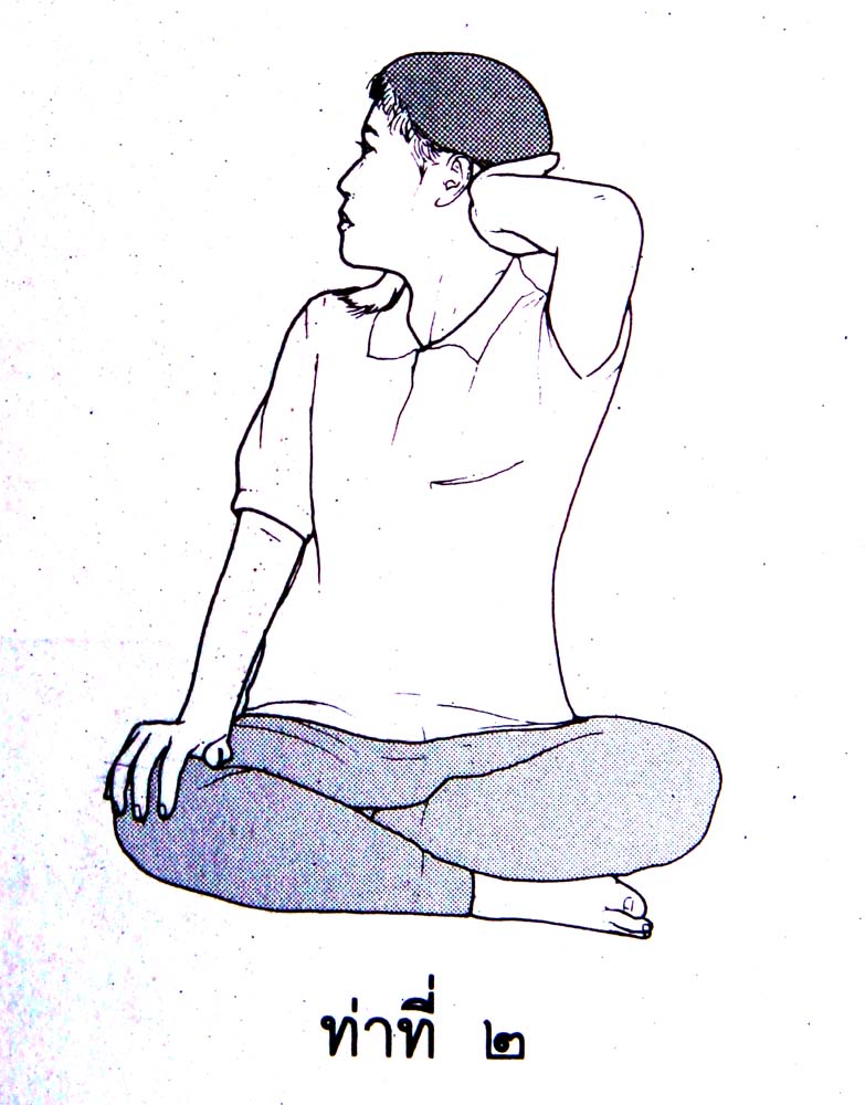 ท่าที่ 1 นั่งขัดสมาธิตามสบายตั้งตัวให้ตรง เอามือซ้ายกดที่เข่าขวาเอามือขวากดดันศีรษะโดยยกข้อศอกขวาขึ้นหายใจเข้าช้าๆ เต็มที่แล้วหายใจออกพร้องทั้งดันศีรษะให้หน้าหันมาทางซ้ายเต็มที่ ให้มีความรู้สึกตึงที่ตนคอ (ไม่ใช่ศีรษะ) แล้วหายใจเข้าพร้อมทั้งผ่อนมือที่ดันและหันกลับมาตามเดิม ทำท่าละ 2-3 ครั้งทั้งซ้ายและขวา