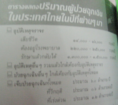 สภาพปัญหา : แต่ละวันคนไทยเกือบ 50 คน ออกจากบ้านแล้วก็จากไปชั่วนิรันดร์จากอุบัติเหตุ ในแต่ละปีคนไทยประมาณ 270,000 คน ได้รับบาดเจ็บจนถึงขั้นทุพภาพหรือพิการ ผู้บาดเจ็บส่วนใหญ่ต้องเข้ารับการรักษาตามสถานพยาบาลประมาณปีละ 1.5 ล้านครั้ง และ 9 ใน 10 คน ต้องรับภาระค่าใช้จ่ายเองทั้งหมด สร้างความสูญเสียทางเศรษฐกิจ และสังคมทั้งต่อตัวผู้ป่วยเอง ต่อครอบครัว และต่อสังคมด้วย เพราะผู้ที่เสียชีวิตกว่าร้อยละ 85 อยู่ในวัย 15 ถึง 60 ปี และกว่าร้อยละ 70 อยู่ในวัย 15 ถึง 45 ปี ซึ่งเป็นวัยทำงานและสร้างผลผลิตให้สังคม
