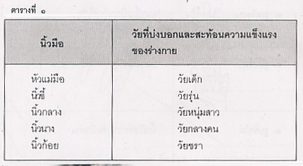 การแพทย์จีนเชื่อว่าความแข็งแรงของพลังม้าม(ในทัศนะของแพทย์จีน) มีผลกระทบต่อสมรรถนะของมือโดยตรง นอกจากนี้นิ้วทั้งห้ายังสามารถสะท้อนสภาพความแข็งแรงของร่างกายตามขั้นตอนของวัยที่แตกต่างกัน คือ (ตารางที่ 1)