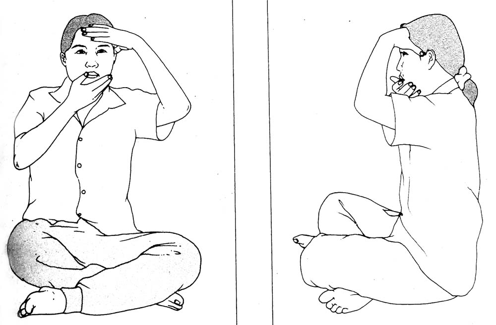 พระฤาษีกเลชฏิคิดท่านี้ไว้แก้ปวดศีรษะ โดยให้นั่งตัวตรง ทำใจให้สบาย มือหนึ่งจับคางช้อนขึ้น อีกมือหนึ่งจับหน้าผาก ใช้หัวแม่มือกดไคลที่ขมับข้างที่ปวด หายใจเข้าช้าๆ ลึกๆ เอาใจไว้ตรงที่ปอด หายใจออกช้า ๆ พร้อมทั้งหมุนหัวแม่มือที่กดขมับไปตามเข็มนาฬิกาข้างละ 5-10 รอบ การหมุนหัวแม่มือต้องกดหมุนจากเบาไปหาหนัก