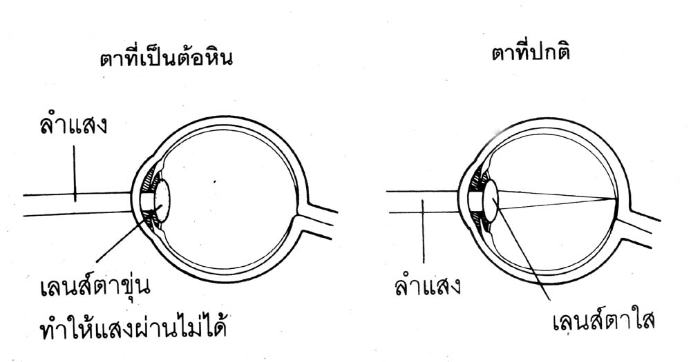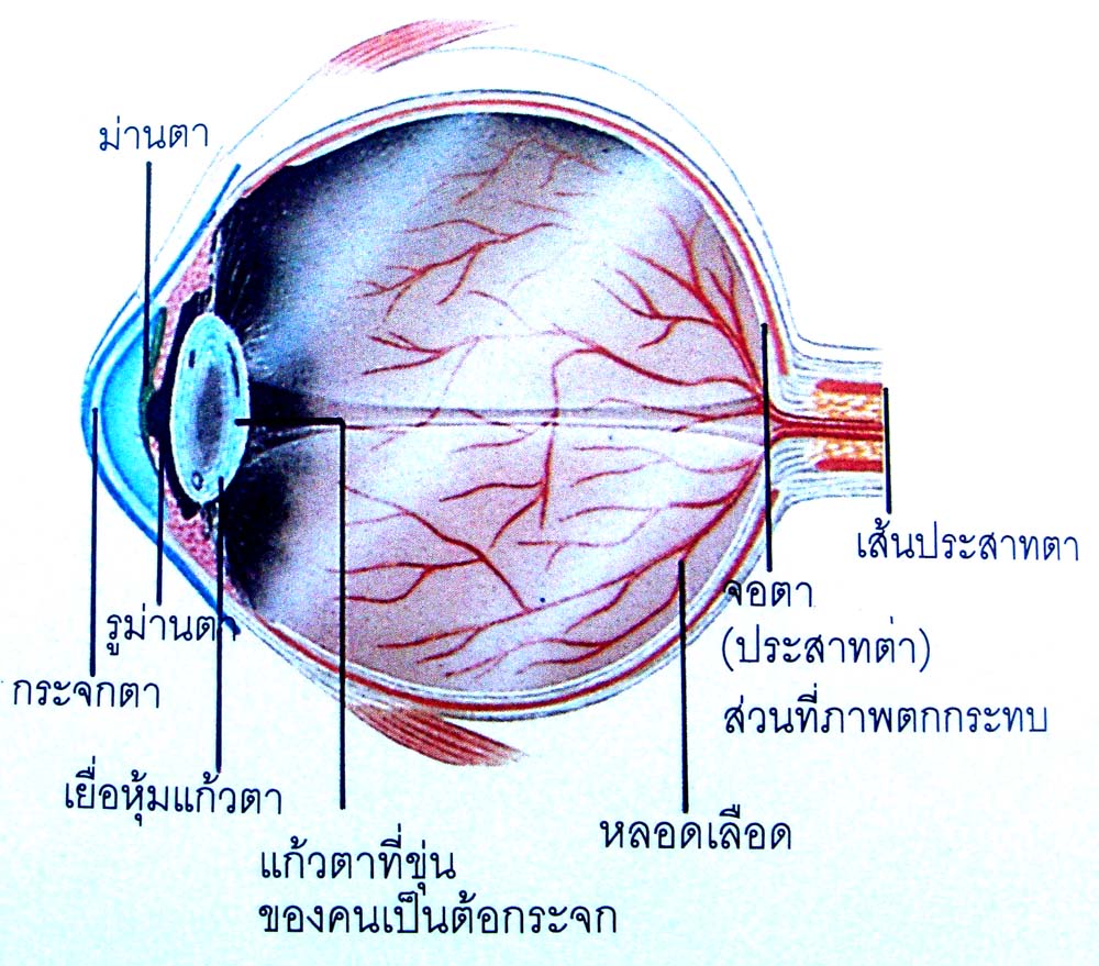 1. แก้วตาหรือเลนส์ตา (lens) ในคนปกติมีลักษณะเป็นวุ้นใสๆ มีหน้าที่คอยปรับการหักเหของแสงที่เดินทางผ่านเข้ามายังนัตย์ตา ให้เกิดเป็นจุดรวมแสงหรือโฟกัสตกลงบนจอภาพ ทำให้มองเห็นภาพต่างๆได้ชัดเจน เปรียบเหมือนกับการปรับโฟกัสของเลนส์ของกล้องถ่ายรูป เมื่อย่างเข้าวัยสูงอายุ แก้วตาจะเสื่อมตามสังขาร ทำให้มีลักษณะขุ่น เมื่อแสงเดินทางผ่านแก้วตาที่ขุ่นนี้จะทำให้การหักเหของแสงผิดเพี้ยนไป ทำให้การมองเห็นภาพพร่ามัวไม่ชัด และเมื่อแก้วตาเสื่อมถึงที่สุดจะทำให้แสงเดินทางผ่านไม่ได้ กลายเป็นตามืดบอด มองอะไรไม่เห็น เราเรียกโรคตาซึ่งเกิดจากแก้วตาขุ่นนี้ว่า “ต้อกระจก” (Cataract)
