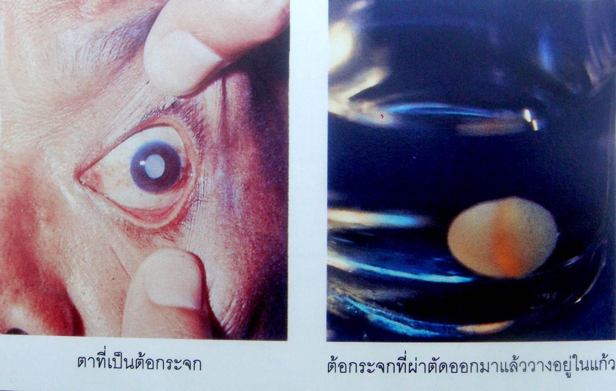 ข. บางคนอาจกลัวการผ่าตัดตา หรือเบื่อรอคิวผ่าตัดที่โรงพยาบาล หันไปรักษากับหมอพื้นบ้าน โดยใช้วิธีเขี่ยหรือกระทุ้งให้แก้วตาหลุดออกจากตำแหน่งเดิม ทำให้แสงผ่านเข้าไปภายในตาได้ คนไข้จะรู้สึกหลุดออกจากความมืดสู่ความสว่างในฉับพลัน (ราวปาฏิหาริย์) และสามารถมองเห็นภาพได้ดีกว่าเดิม (แม้จะไม่ชัดเจนก็ตาม) แต่ระยะต่อมาอาจเกิดโรคแทรกซ้อน เช่น เลือดออกในวุ้นลูกตา ต้อหิน เป็นต้น ทำให้ตาบอดอย่างถาวรได้