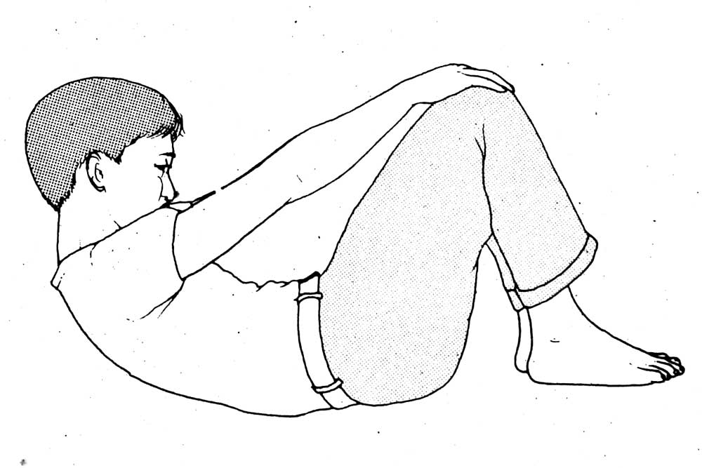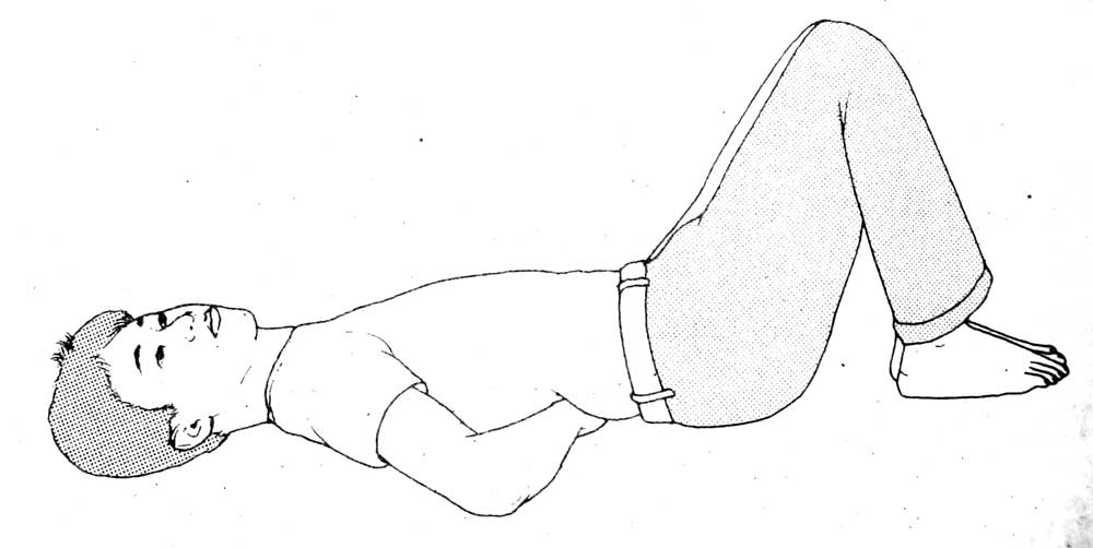 ท่าที่ 1 นอนหงาย งอเข่า ขณะงอเข่าฝ่าเท้าแตะพื้นจะทำให้แผ่นหลังแบนราบ ทำให้กล้ามเนื้อหลังได้พักเต็มที่ วางมือข้างหนึ่งใต้แผ่นหลัง (นอนทับมือ) เริ่มเกร็งกล้ามเนื้อหน้าท้องเพื่อกดทับมือ