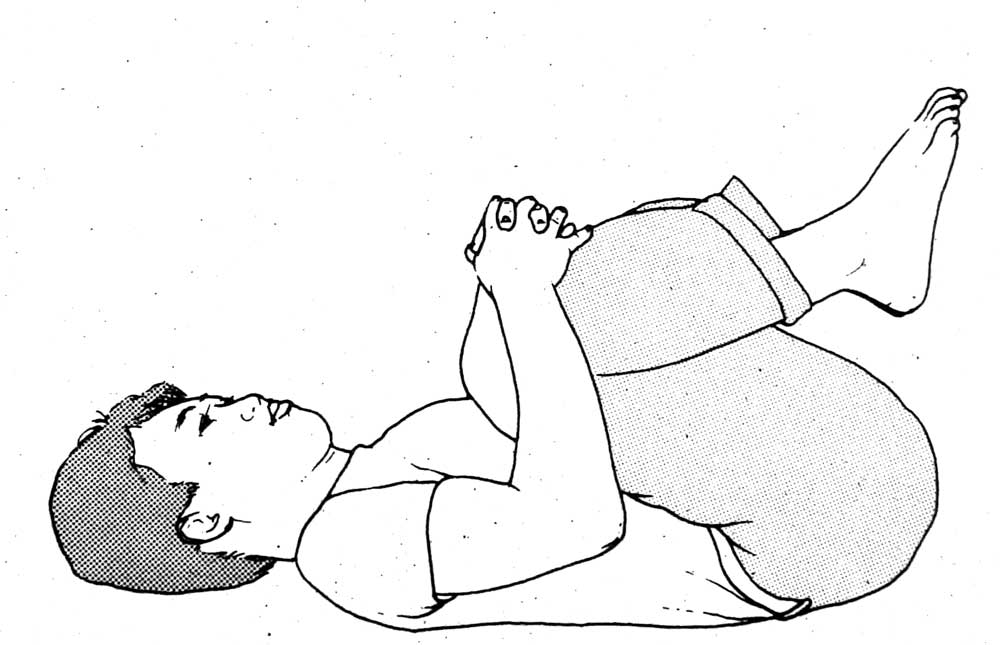 ท่าที่ 2 นอนราบ งอเข่า 2 ข้างมาให้ชิดหน้าอก ใช้มือจับเข่าให้แนบหน้าอก จากนั้นเหยียดเข่าออกไป