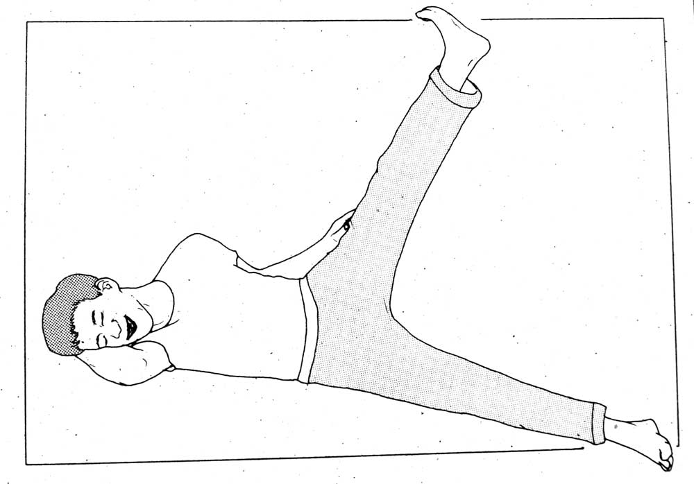 นอนตะแคงข้างค่อยๆ กางขาออกสลับคุกเข่า ควรบริหารโดยนอนสลับข้าง ตะแคงขวาก่อน แล้วจึงตะแคงซ้าย เป็นต้น