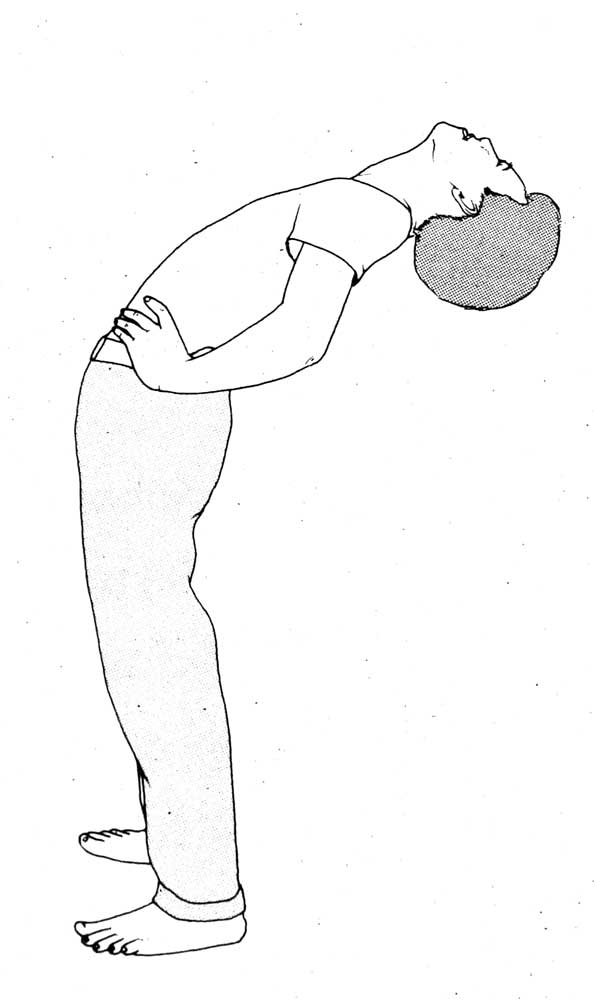 ท่าที่ 1 ยืนตัวตรงมือเท้าสะเอว ค่อยๆ แอ่นหลังทีละน้อย