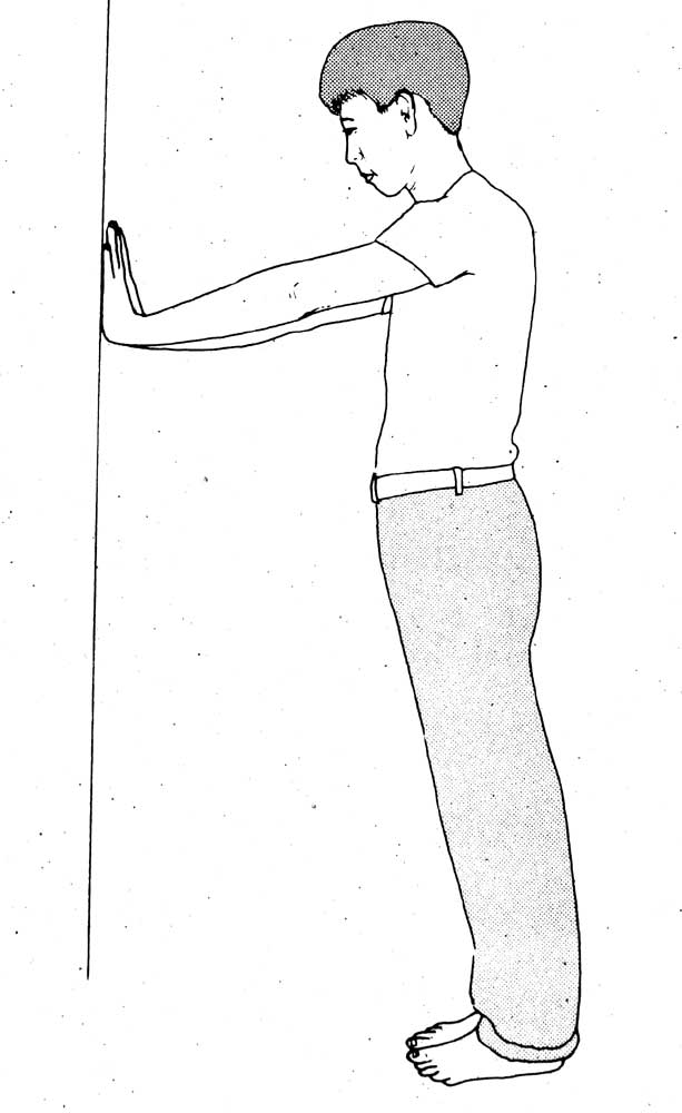 ท่าที่ 2 ยืนหันหน้าเข้าหากำแพง ใช้มือเท้ากำแพง ฝ่าเท้าแนบพื้น ค่อยๆ ออกกำลังยันข้อเท้า และข้อเข่า