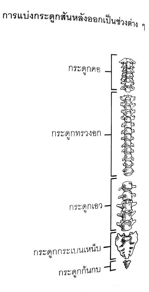 กระดูกสันหลังประกอบด้วยส่วนต่างๆ 5 ส่วน ดังนี้ คือ ส่วนคอ (7 ชิ้น) ส่วนอก (12 ชิ้น) ส่วนเอว (15 ชิ้น) ส่วนกระเบนเหน็บ และส่วนก้นกบ