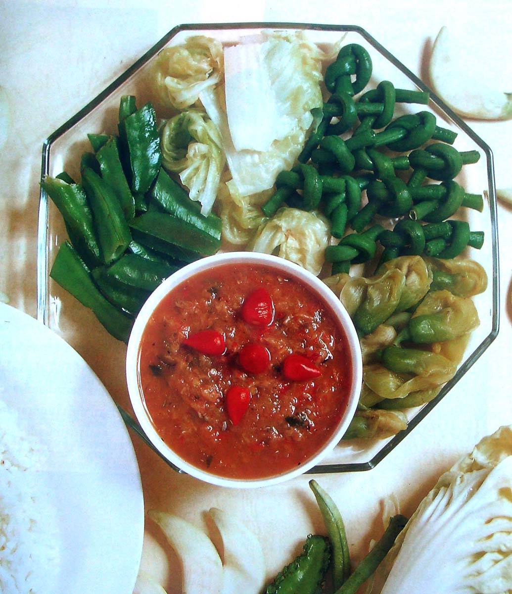 กะหล่ำปลีหั่นเป็นคำๆ ถั่วฝักยาวหั่นประมาณ 4 นิ้ว ผักกาดขาว ดอกแค ถั่วพู นำผักไปลวกในน้ำเดือด อย่านานมากและตักขึ้น (เฉพาะถั่วฝักยาวและถั่วพูให้นำมาแช่ในน้ำเย็นเพื่อให้ผักมีสีเขียวน่ากิน)