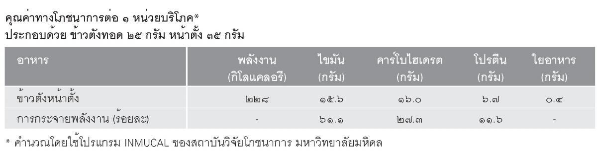 คุณค่าทางโภชนาการของข้างตังหน้าตั้ง สำหรับบุคคลในกลุ่มที่ต้องการพลังงานวันละ 1,600 กิโลแคลอรี (เด็ก หญิงวัยทำงาน ผู้สูงอายุ) จัดว่าให้ปริมาณพลังงานและไขมันค่อนข้างมาก คือ 1 หน่วยการกินให้พลังงานประมาณ 228 กิโลแคลอรี โดยเป็นพลังงานที่มาจาก ไขมันถึงร้อยละ 61 ของพลังงานทั้งหมด หรือคิดเป็นประมาณร้อยละ 29 ของความต้องการไขมันต่อหนึ่งวัน ไขมันส่วนใหญ่มาจากน้ำมันที่ใช้ในการทอดข้าวตังและกะทิที่เป็นส่วนประกอบในหน้าตั้ง โดยจะเป็นไขมันชนิดอิ่มตัวเป็นส่วนใหญ่ ซึ่งการกินไขมันอิ่มตัวมากเกินไป อาจเพิ่มโคเลสเตอรอลในเลือดได้ ดังนั้น ถ้าวันไหนที่กินข้าวตังหน้าตั้ง ในมื้อถัดไปควรลดหรืองดอาหารที่มีไขมันสูงและมีกะทิเป็นส่วนประกอบ ได้แก่ อาหารประเภทผัด ทอด รวมทั้งแกงและขนมหวานที่ใส่กะทิ ทั้งนี้เพื่อ เป็นการปรับปริมาณพลังงานและไขมันให้มีความสมดุลมากขึ้นในวันนั้น และเนื่องจากข้าวตังหน้าตั้งเป็นของว่างที่มี ใยอาหารน้อยมาก จึงควรกินผักและผลไม้ให้มากขึ้นด้วย