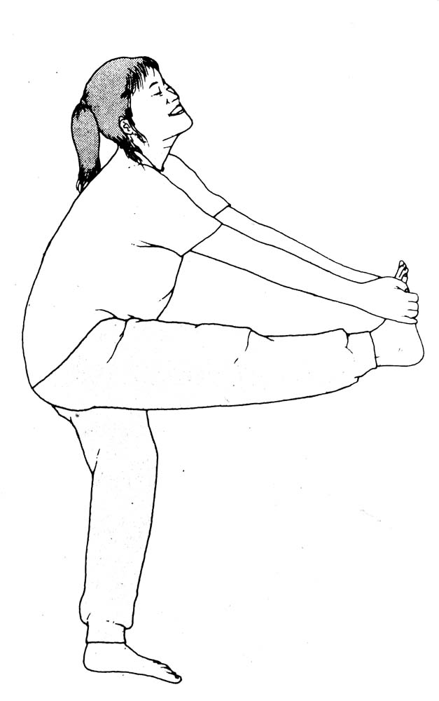 ท่านฤาษีมาฆะท่านคิดท่านี้ไว้แก้อาการเท้าเป็นเหน็บ โดยท่านบอกให้ยืนขาตรง จะยืนพิงเสาหรือฝาบ้านก็ได้เพื่อกันล้ม ยกเท้าข้างที่เป็นเหน็บขึ้น เอามือทั้งสองข้างจับฝ่าเท้าไว้ ย่อเข่าเล็กน้อย หายใจเข้าช้าๆ จนสุดแล้วหายใจออกช้าๆ พร้อมทั้งยันฝ่าเท้าไปข้างหน้าจนสุดเต็มที่ แล้วหายใจเข้า-ออก ซ้ำกันอีก สามครั้ง แล้วเปลี่ยนกลับมาอยู่ในท่าเดิมสบายๆ